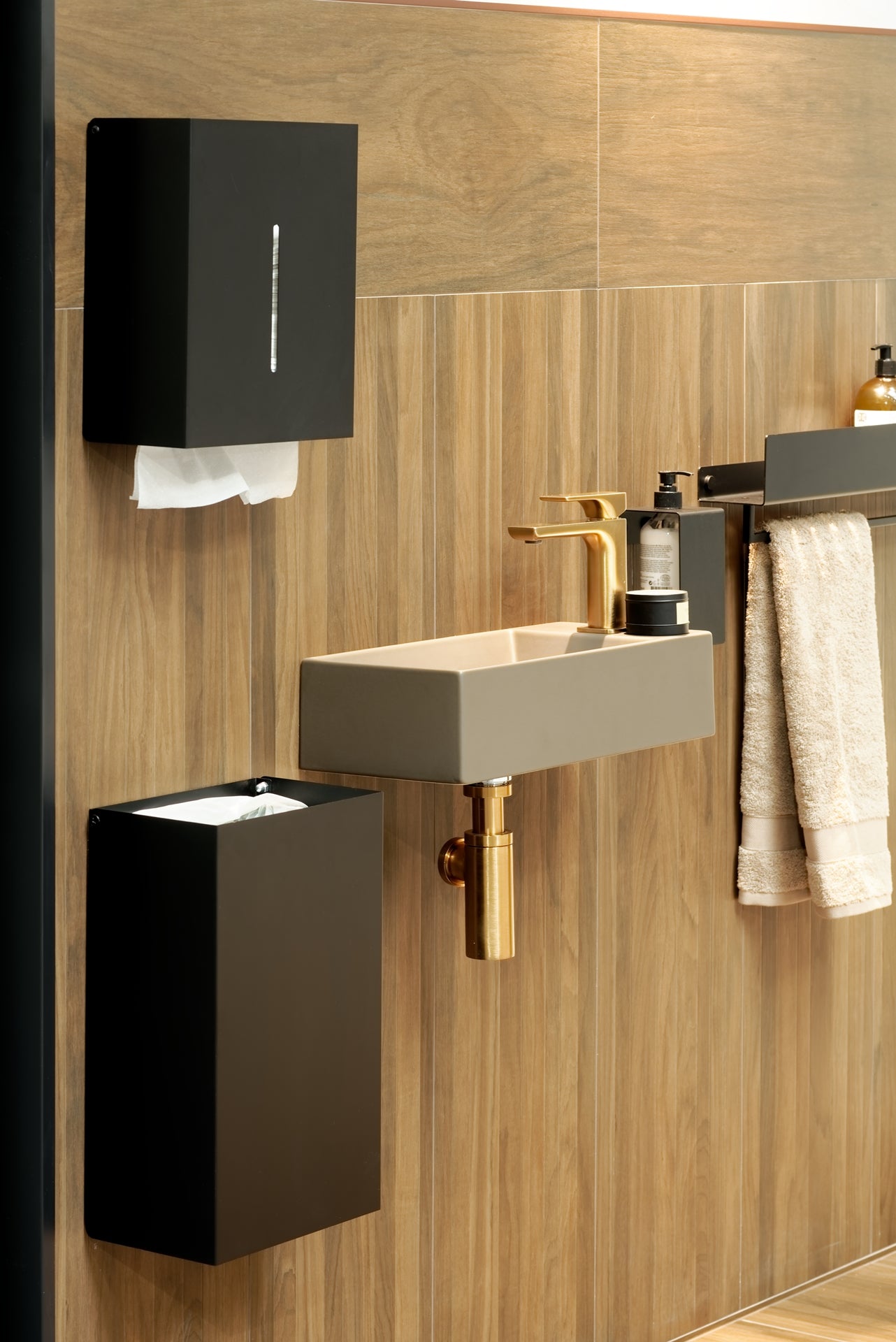 In B2B-Projekten zählen Zuverlässigkeit und ein durchgängiges Design, daher setzen wir auf Materialien und Oberflächen, die für den täglichen Einsatz konzipiert sind. Der Papierhandtuchspender DERBO wird aus verzinktem Stahl gefertigt und als langlebige Alternative zu Kunststoffspendern entwickelt; die Pulverbeschichtung unterstützt seine Widerstandsfähigkeit und hochwertige Optik über viele Jahre. Der Abfallbehälter DERBIN (unter anderem für öffentliche Bereiche und Restaurants) besteht aus pulverbeschichtetem Edelstahl, was ihn unempfindlich gegenüber Beschädigungen und Korrosion macht.