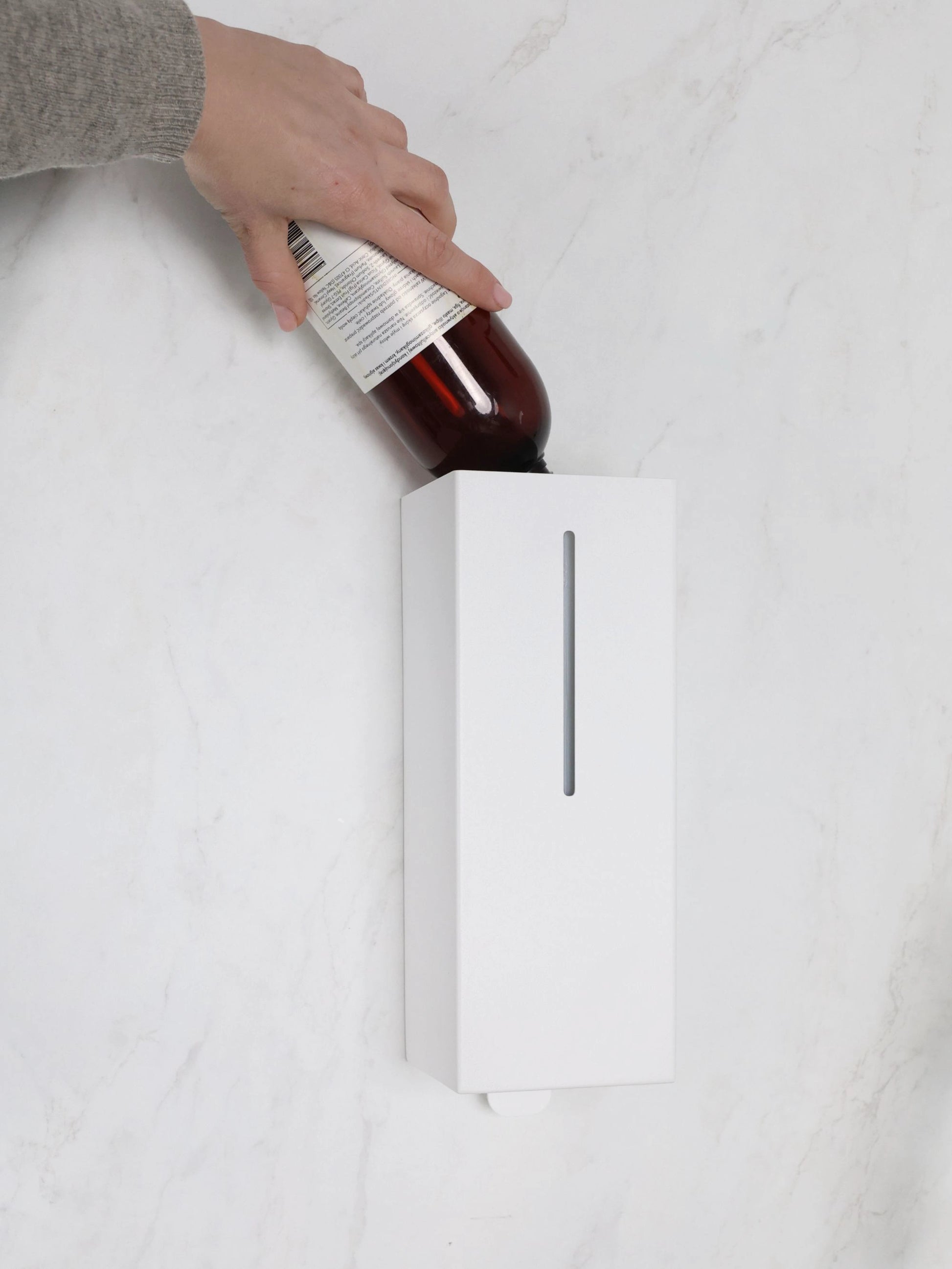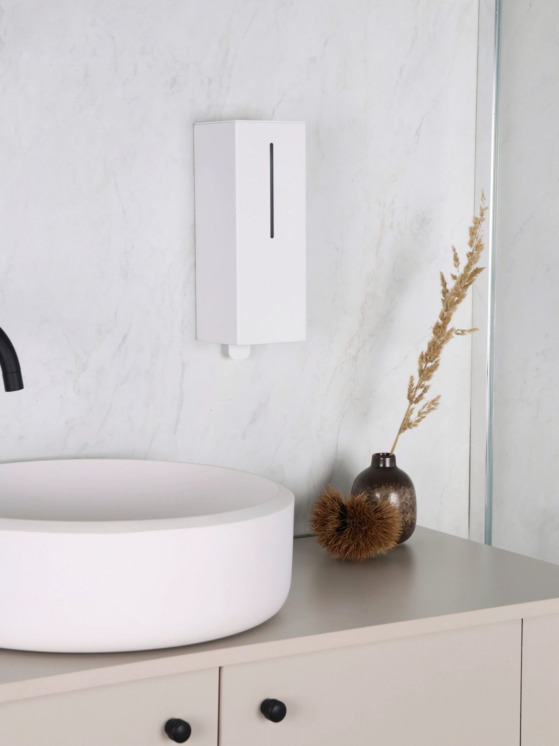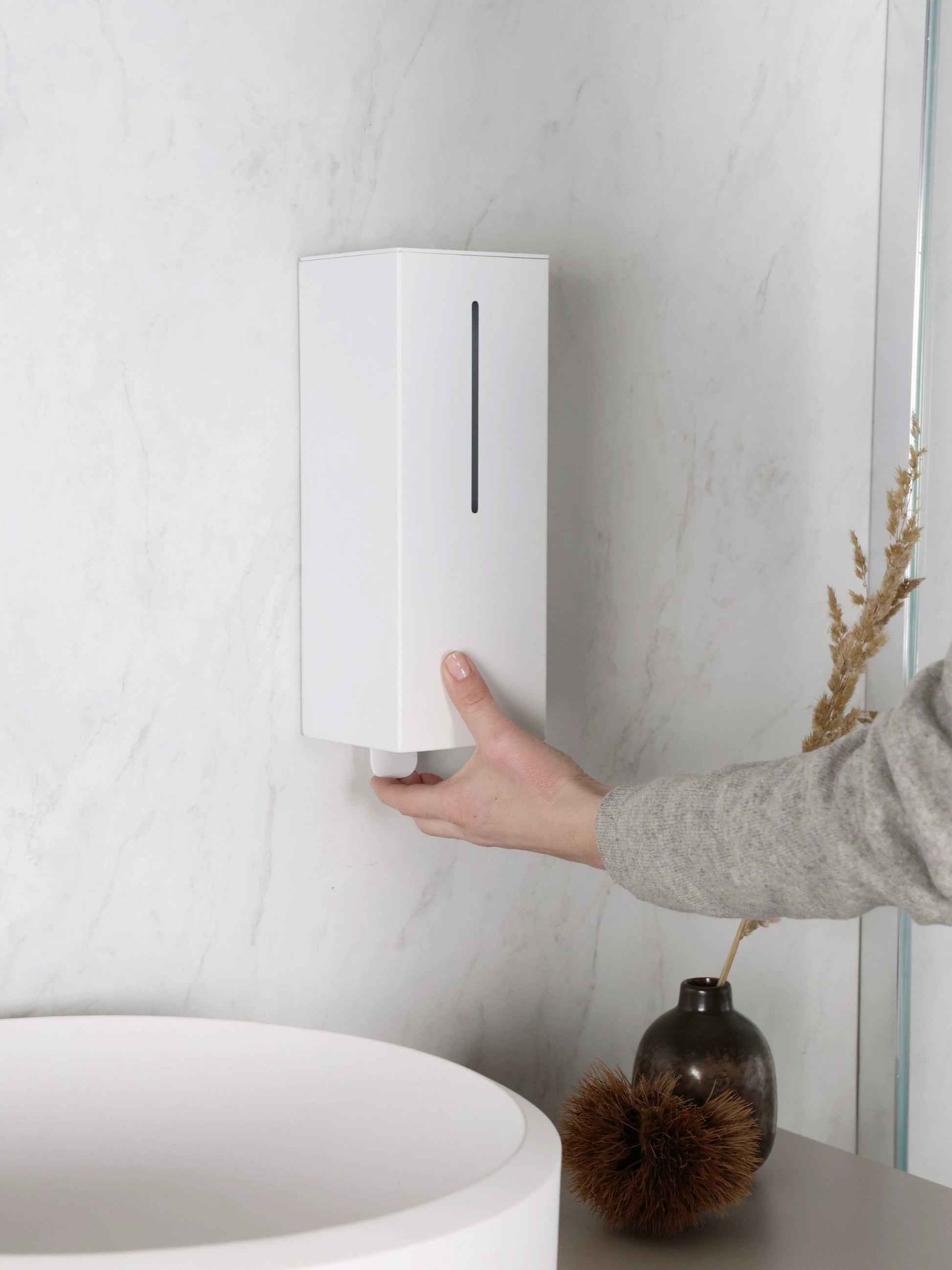 Die schlichte, geometrische Form des Spenders, der verdeckt eingebaute Handmechanismus und das Fehlen hervorstehender Tasten sorgen dafür, dass das Gerät den Raum nicht dominiert, sondern ihn dezent ergänzt und zugleich ein elegantes und praktisches Ausstattungsdetail bleibt.